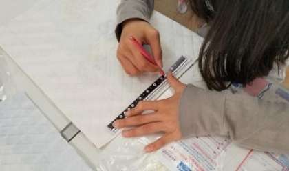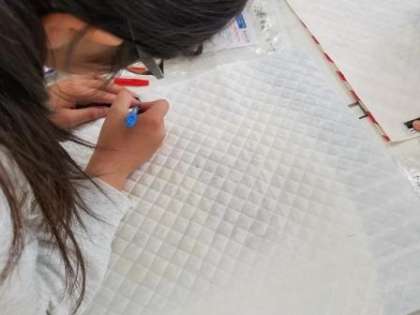 それぞれが選んだお気に入りのデザインが入った生地に印をつけるところからスタートです。