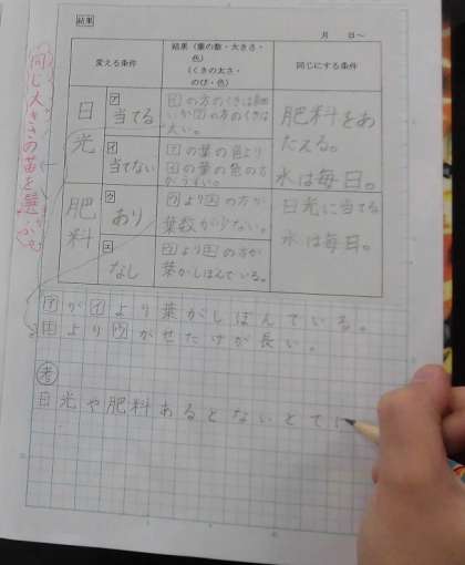 今回の授業では、条件を変えて育てた植物を観察し、比較しながらちがいをみつけ、そこから分かることを考えました。