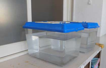 水道水ではメダカが長生きできないことも学習。取り換え用の水も水槽に用意しています。