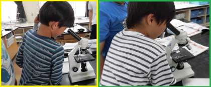 けんび鏡で観察する時の注意点や、器具のそれぞれの名称、接眼レンズ・対物レンズの 倍率などについてプリントにまとめ、実際にけんび鏡をのぞきました。