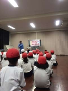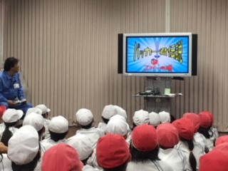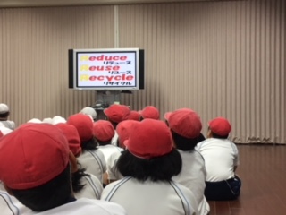 2時間目はパッカー車を見学し、3時間目は多目的室にて大型テレビを使いながらごみの出し方を始めに学びました。