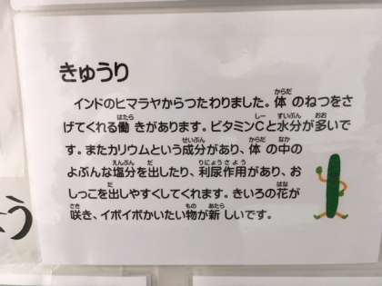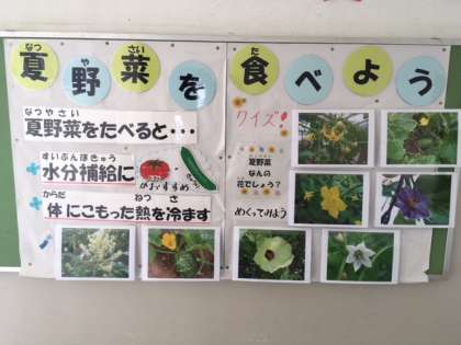 さて、給食の掲示版でも夏野菜を食べようという掲示物を掲示しています。旬のものを食べることで、夏に不足しがちな水分やビタミン、ミネラルを効果的に補給することができます。お家でも旬の夏野菜や果物をとり入れてみてはいかがでしょうか。また、期末懇談に来校されたときにはぜひご覧ください。