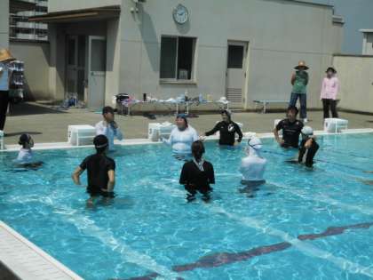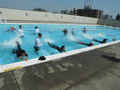実際に子どもの立場に立って学習すると、指導のポイントが見えてきて、有意義な研修会となりました。2学期の子どもへの水泳指導に活かしていきたいと思います。