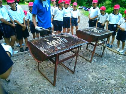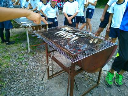 魚をつかまえたあとは、塩焼きでいただきます。