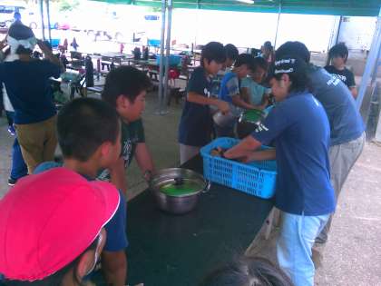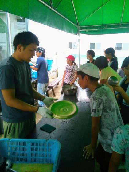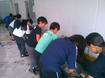 自分たちが使った鍋や飯ごう、食器などの洗い物をがんばっています。