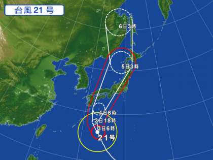4日(火)午後には、勢力を維持したまま四国か近畿、東海に接近、上陸する予報です。厳重な警戒をお願いします。