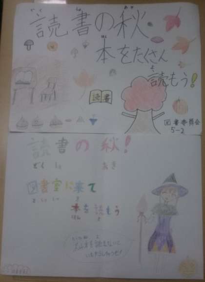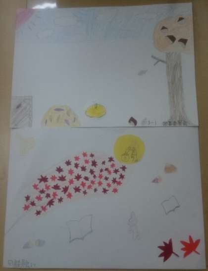 図書委員会の子どもたちが作成していた秋の掲示物が完成しました。学級ごとに1枚ずつ作りましたが、折り紙を別に折ってはりつけたり、秋の名物がたくさん描かれていたりとおもしろい工夫がある素敵な仕上がりになりました。
