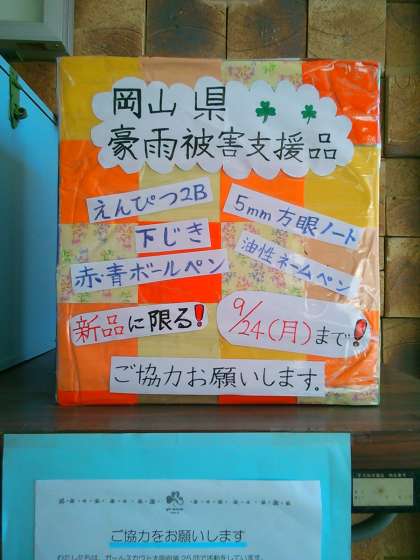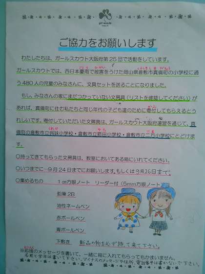 さて、先日の台風21号や北海道の地震など災害が続いていますが、7月の「西日本豪雨」で大きな被害にあった岡山県真備町の小学校に文房具を送る活動をガールスカウトさんがおこなっています。本校でもその趣旨に賛同し、学校の玄関に文房具を入れる箱を今週の金曜日まで設置しています。まだ使っていないもので、送る文房具の種類も決まっていますが、困っている同じ年代の子どもたちに寄付していただければ嬉しいです。応援メッセージも添えていただいて構いません。
