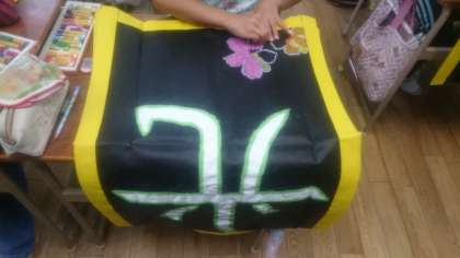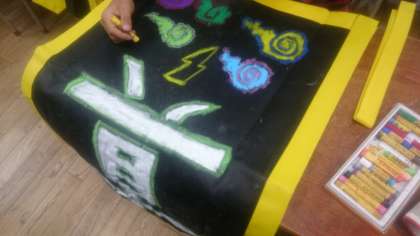 2学期の図画工作科では、運動会の演技の時に着るハッピを作っています。背中になんという文字を入れるかと、ハッピの裾に入れる模様を考えています。裾の模様は、沖縄の伝統的な染色技法である紅型の模様を参考にしながら、子どもたちがそれぞれ工夫しながら描いています。