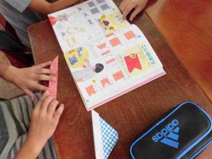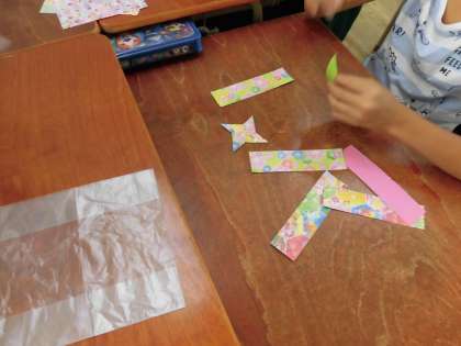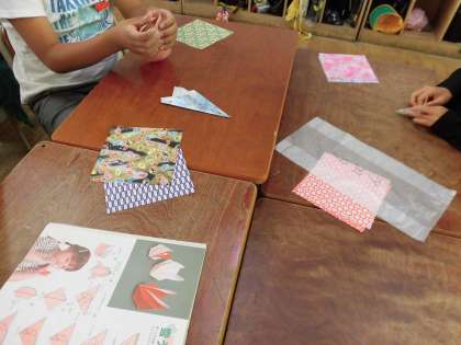 今日は活動の時に渡すプレゼントを折り紙で折りました。かぶとや手裏剣、花など、班によって色々なものができあがっていました。