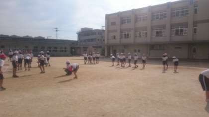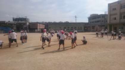 体育では、高跳びにつながる動きをゴムを使い学習しました。
