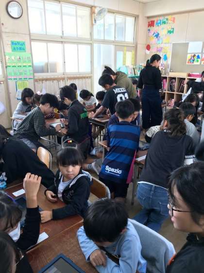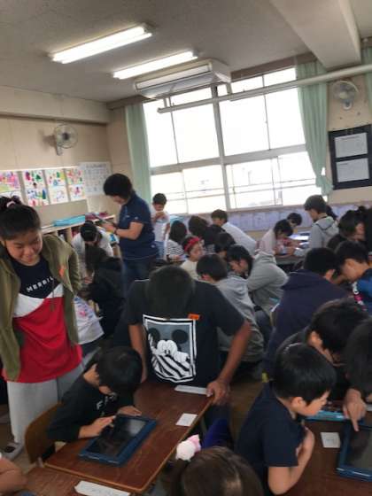 6年1組の子ども達が、1年1組にタブレットの操作を教えに来てくれました。