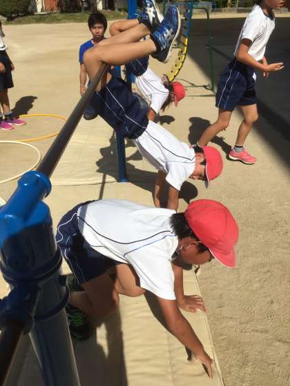 サーキット運動を中心に鉄棒を使い逆立ちをします。