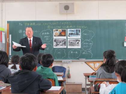 そこで、地域に在住で香簑小学校出身、学童疎開経験者でもある中尾敏郎様にゲストティーチャーとしてお越しいただき、当時の苦労や思いを話していただきました。