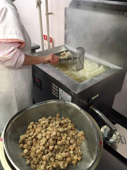 マグロに片栗粉をまぶして丁寧にあげています。それをソースとまぜあわせるのですが、その時、2人がかりでしています。それは、さっとソースをからめれるようにしているためです。甘いケチャップ味に仕上げています。
