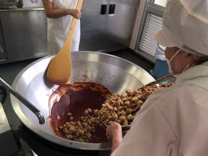 マグロのオーロラ煮は魚が苦手な児童でも食べやすくしてあり、児童に大変人気な献立です。今日はそのメニューをつくっている様子を掲載します。