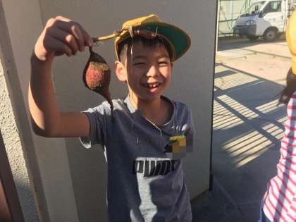 小さいのが採れて大笑いする子。
