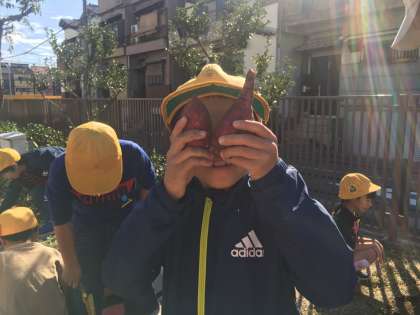 大きいお芋が採れて、大喜びする子。