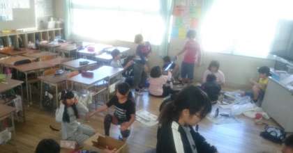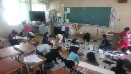 子どもたちは作業を分担しあったり、指示を出しあったり、協力して一つの舞台をつくりあげていっています。さてさて、どんなものができあがるのでしょうか。