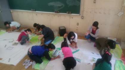 来週の学習発表会にむけて、ただいま役ごとにわかれて、舞台に必要な小道具や背景、衣装などを制作しています。