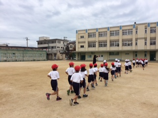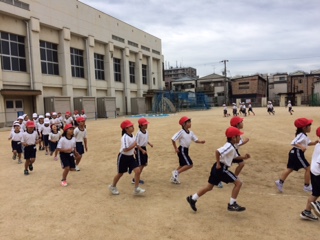 大好きな体育の時間です!運動場のトラックをみんなで足並みを揃えて5周強走り、そのあと、自分のペースで3周走りました。