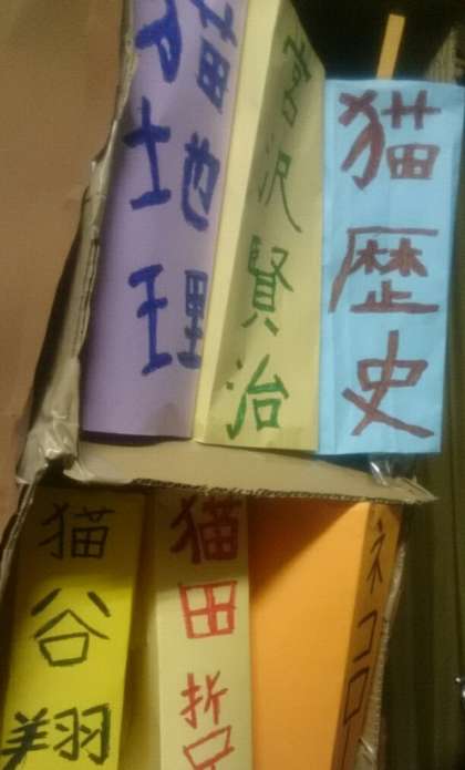 机に置く札は、絵本「猫の事務所」(三起商行)を参考に作っていました。