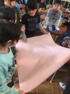 この日は、平方メートルの学習をした後、自分たちで実際に模造紙でつくってみました。