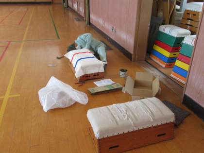 新技開発の裏では、管理作業員による跳び箱修理の努力があります。