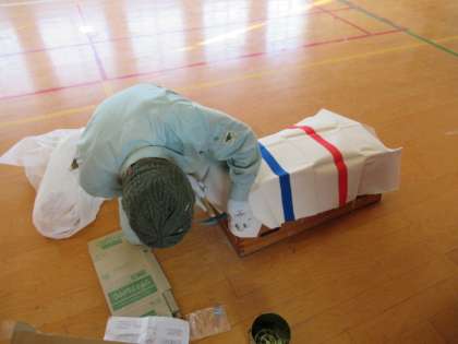 子どもたちが安全にケガの無いように体育ができるように運動用具の補修をしています。見えないところでみんなを支えている人がいることを子どもたちも知ってほしいですね。