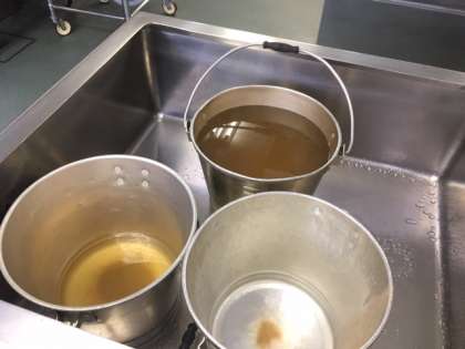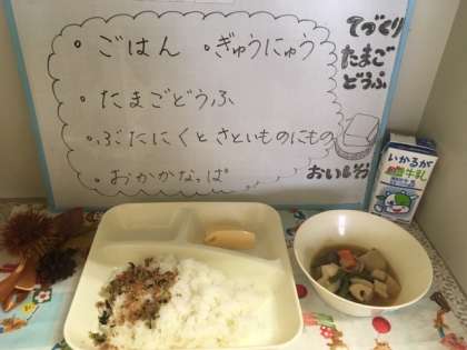 今日の給食では、かつおぶしから出汁をとってしばらく出汁を冷まし、みりん、塩、卵液を混ぜ合わせて、卵豆腐を作りました。(30分蒸して完成です。)