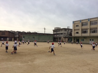 トラックを10周強、そして縄跳び名人1級を目指して頑張ったあと、お楽しみの鬼ごっこタイムです。