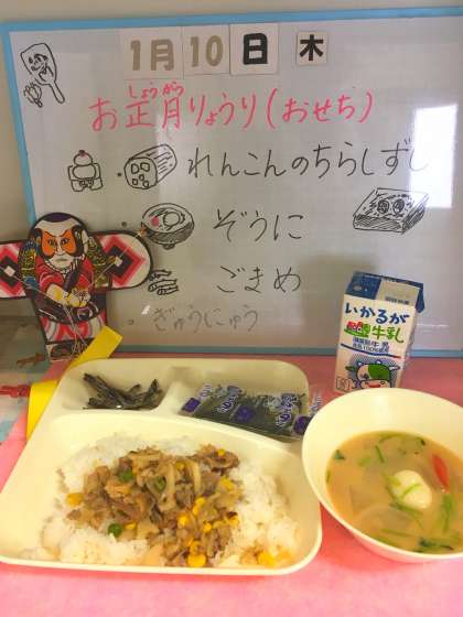 新年が明け、給食が8日〜始まり、徐々に児童のみんなは給食に馴染んできています。今日の給食は、1月の行事食に相応しい「正月料理」です。ごまめは苦い味だけど、「かしこくなるよ。」と担任の先生が声かけてくださったり、パクパク食べていました。給食では、弱火でじっくり煮た花かつおだけでだしをとり、かつおだしと白みそ、赤みそを入れた雑煮をつくりました。みんなおいしそうに食べていました。