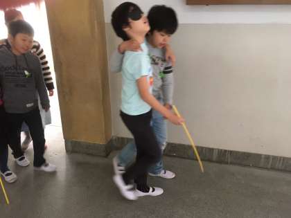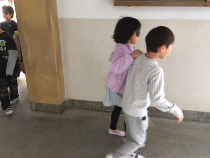 実際にアイマスクをし、講堂の中、校舎の中(階段)を歩きました。