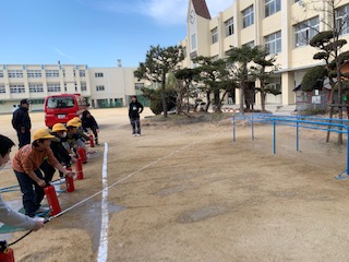 運動場で避難の振り返りをしたあと、低学年〈1〜3年〉は運動場の一角で、水消火器体験をしました。