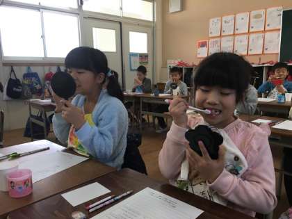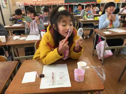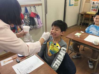 虫歯になる原因=しこう、について教えてもらい、どれくらい磨き残しがあるのかをチェックしました。歯が赤く染まるところに磨き残しが。。1回目のチェックは、みんな真っ赤でしたよ。その後、赤く染まったところを念入りに歯磨きしました。