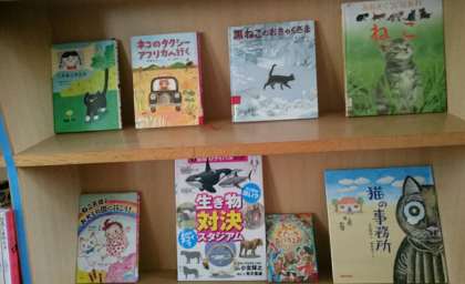 図書館でも、学校図書館補助員の清村先生が猫の本を選書してコーナーにまとめてくださいました。5年生が学習発表会で披露した「猫の事務所」(宮沢賢治)や、国語科の教科書に掲載されている「大造じいさんとガン」の作者・椋鳩十による「猫物語」など、たくさん猫の本があることに驚きますね。