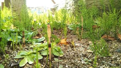 桜の花は満開近し。中庭には「つくし」も元気よく伸びています。