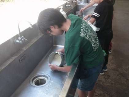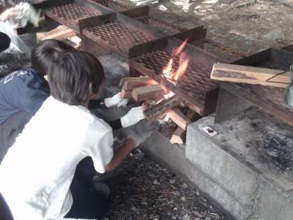 かまど、ごはん、カレー。どの役割の手際よく進めています。