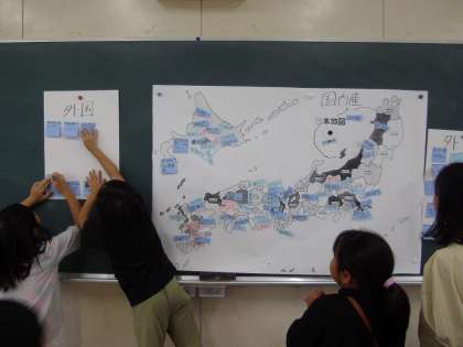 野菜やお肉などお家にある食品の都道府県名や国名を付箋に書いてまとめていきました。