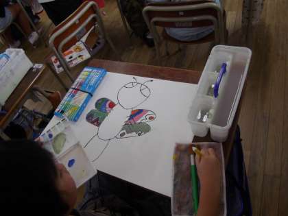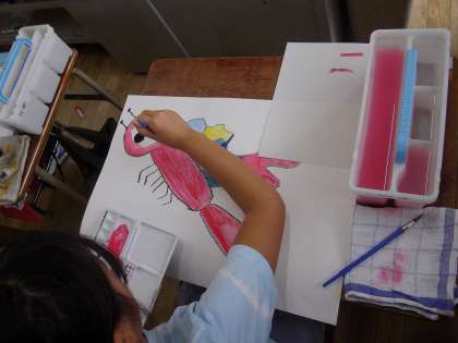 鮮やかな羽になるように、赤、青、黄、白の絵の具で、いろいろな色をつくり丁寧に塗り進めていきます。体には、羽の中で特徴的な色を使っています。