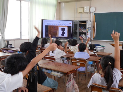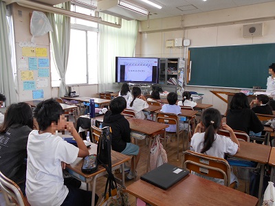 計画委員さんがプレゼンするクイズを、各教室に分かれたスマイル班のみんなが回答しています。