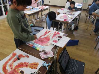 図画工作科の時間では、タブレットに映し出したザリガニをよく観察しながら絵を描きました。