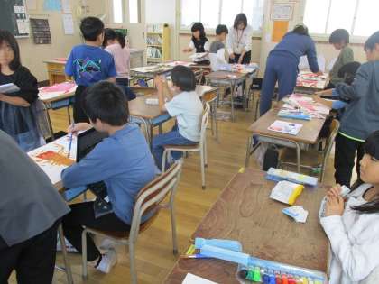 いよいよ作品づくりが本格的にスタートし、四つ切の画用紙を受け取り、子どもたちは集中して描き始めました。