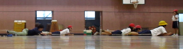 体育館で、3年生が体育の学習として「ワニ歩き」に取り組みました。ワニ歩きは、うでと足を使って体を低くしながら前に進む運動で、体の使い方やバランス感覚を養うことができます。子どもたちは、楽しそうに声をかけ合いながら一生懸命に取り組んでいました。
