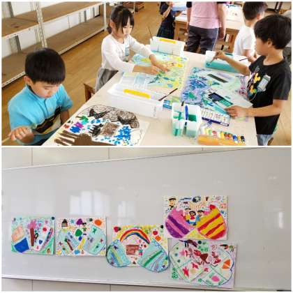 2組は、図工室で「ひみつのたまご」の仕上げをしています。