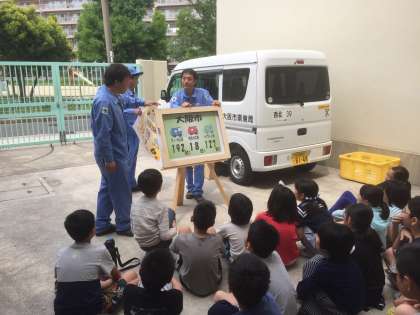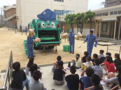 環境局の方に来ていただき、パッカー車体験をさせていただいています。