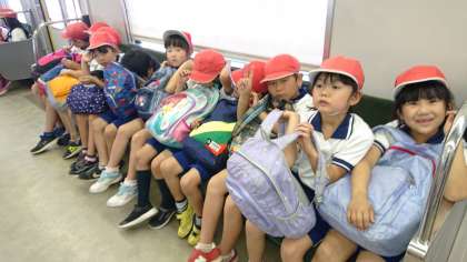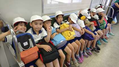 各駅停車の電車に、つめつめになりながらも静かに座って乗車している子ども達。