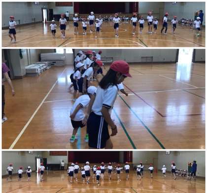 体育の時間に、1年生と6年生がペアになって、体力テストのシャトルランをしています。