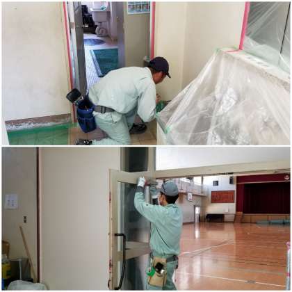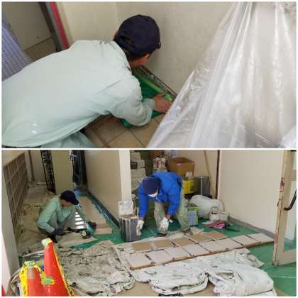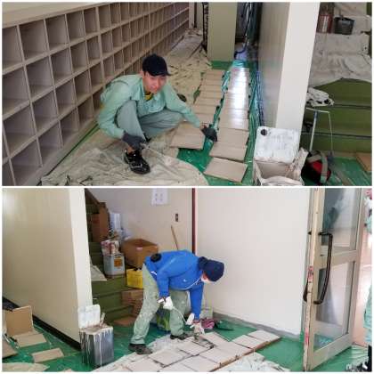 昨日から、講堂入口周辺を美しく大変身させるために【営繕3班】の皆さんが作業に取り掛かってくださっています。