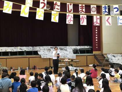 講堂に飾られている「歌島まつり なかよく楽しもう」も児童会メンバーが作成しました。